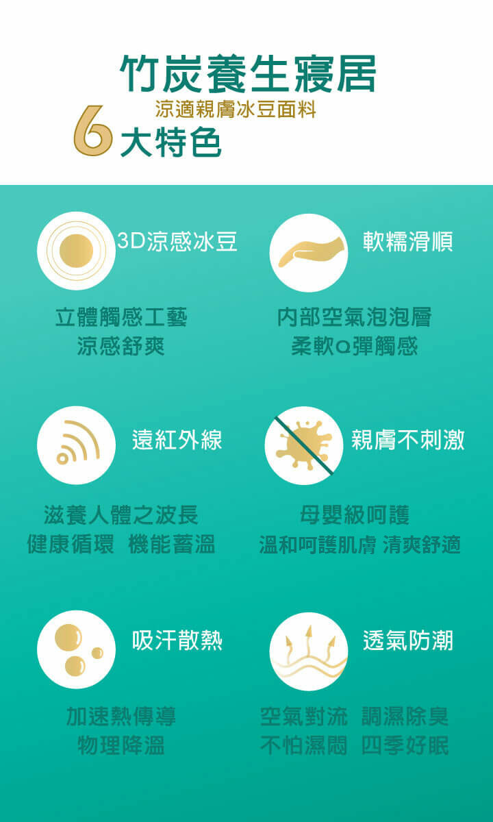 竹炭優眠枕的竹炭粒墊層內含CAS國家驗證的優質竹炭,能釋放遠紅外線,促進血液循環。再加上竹炭多孔質特性,排除汗水濕氣、淨化空氣、隔離過敏源,幫助睡眠和提升休息品質。