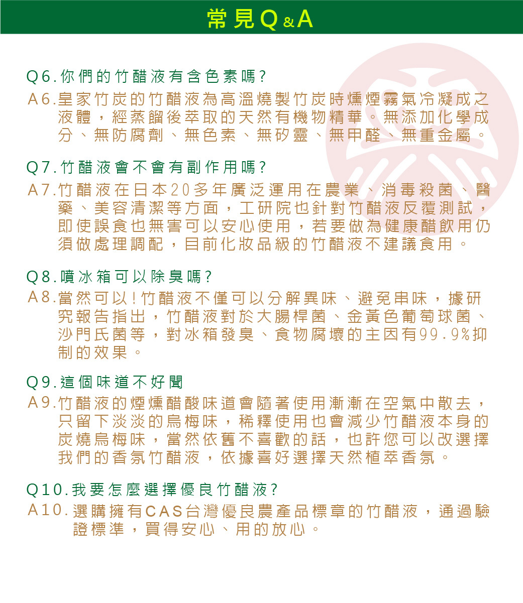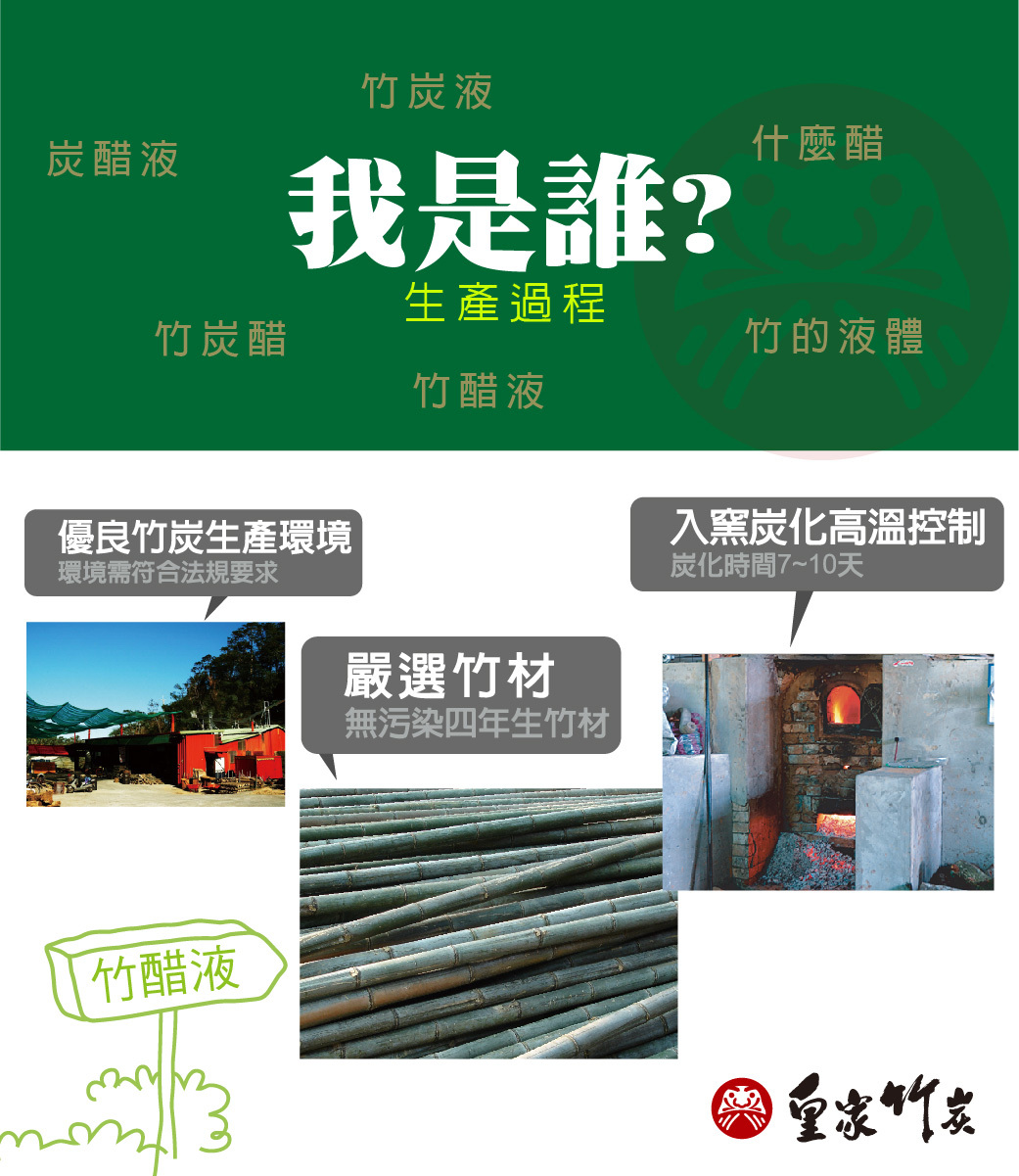 皇家竹炭的竹醋液為高溫燒製竹炭時燻煙霧氣冷凝成之液體,經蒸餾後萃取的天然有機物精華。無添加化學成分、無防腐劑、無色素、無矽靈、無甲醛、無重金屬。