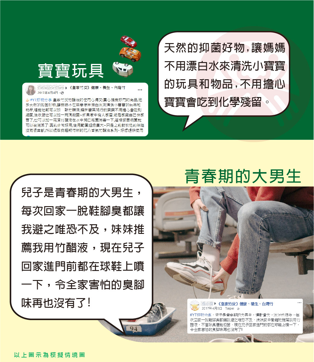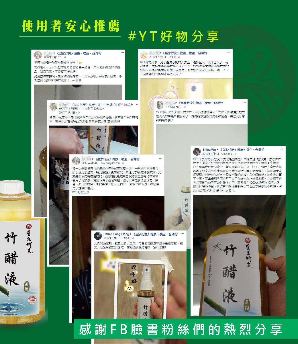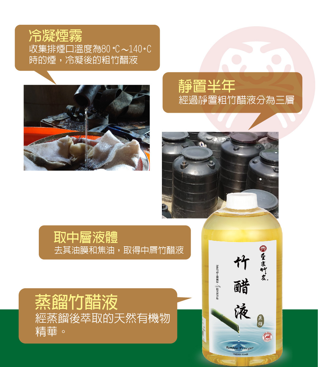 • 優選台灣竹材精煉而成的竹醋液體,不含化學添加物質,PH值於2~3間,酸度3.5~4.5。