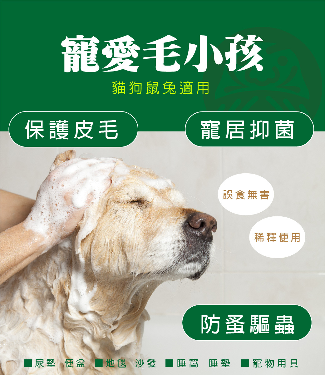 • 能分解異味、長效抑菌,獨特煙燻氣味能驅除蚊蟲、防跳蚤、驅壁蝨,守護寵物健康。