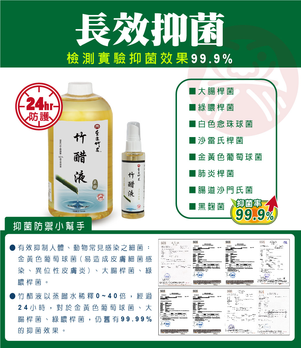 • 竹醋液以蒸餾水稀釋0~40倍,經過24小時,對於金黃色葡萄球菌、大腸桿菌、綠膿桿菌,仍舊有99.99%的抑菌效果。