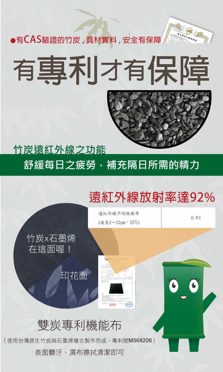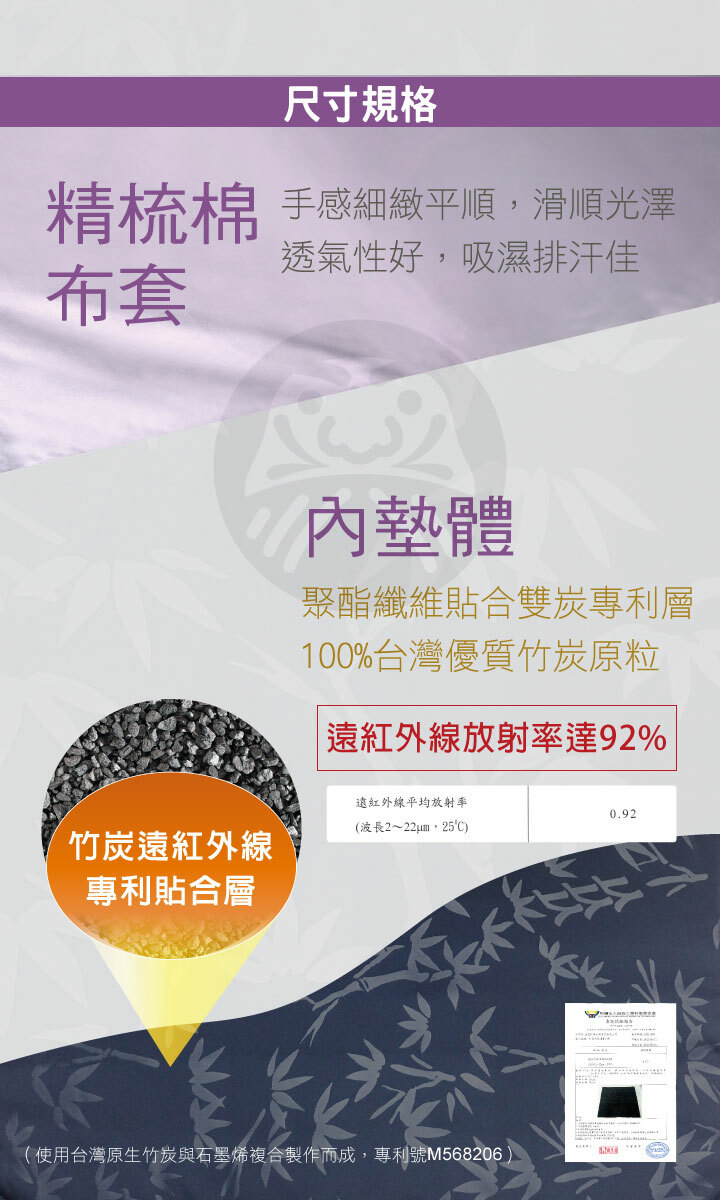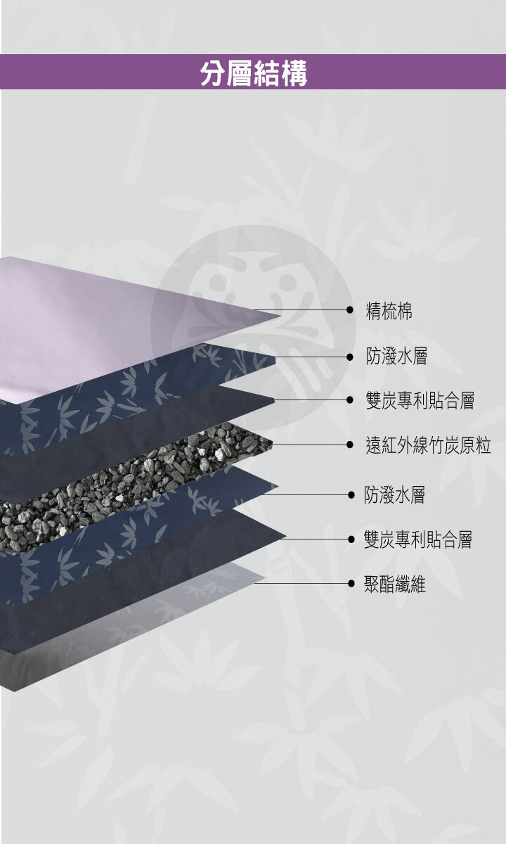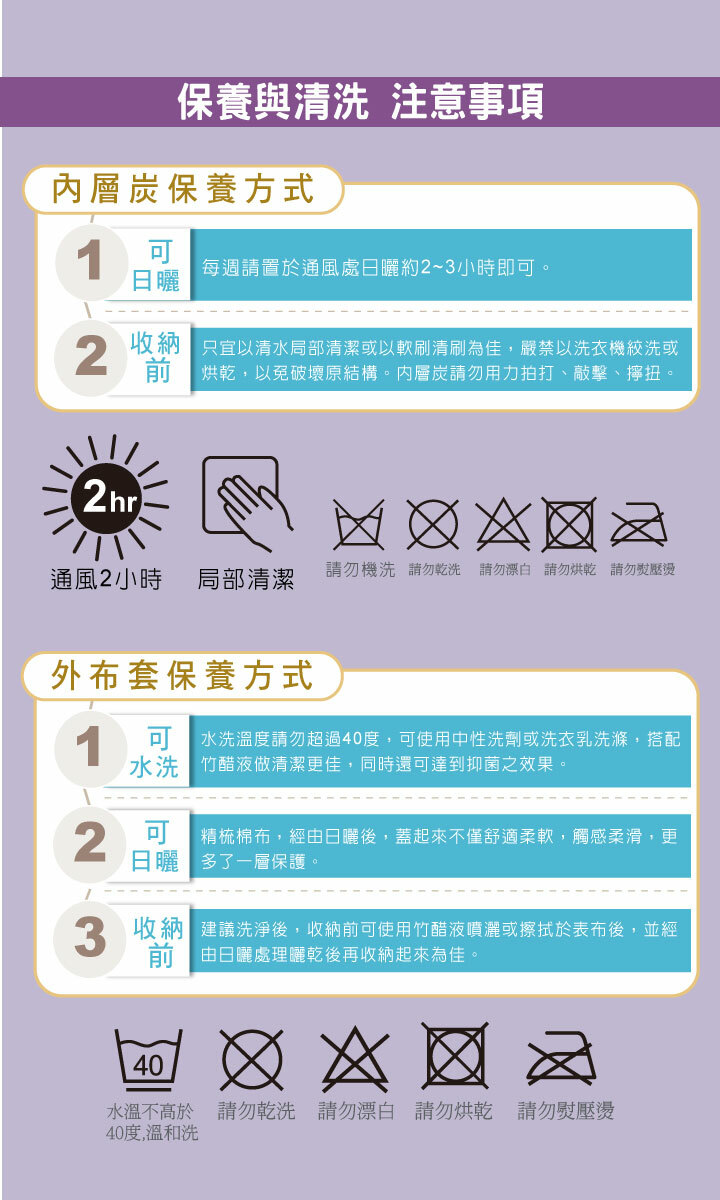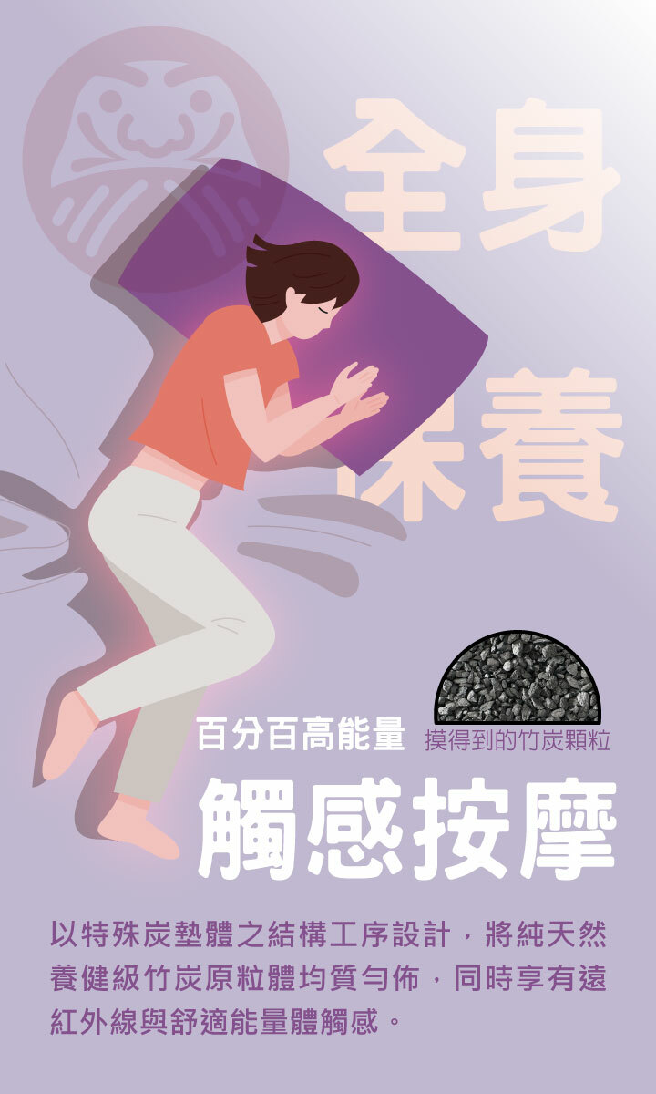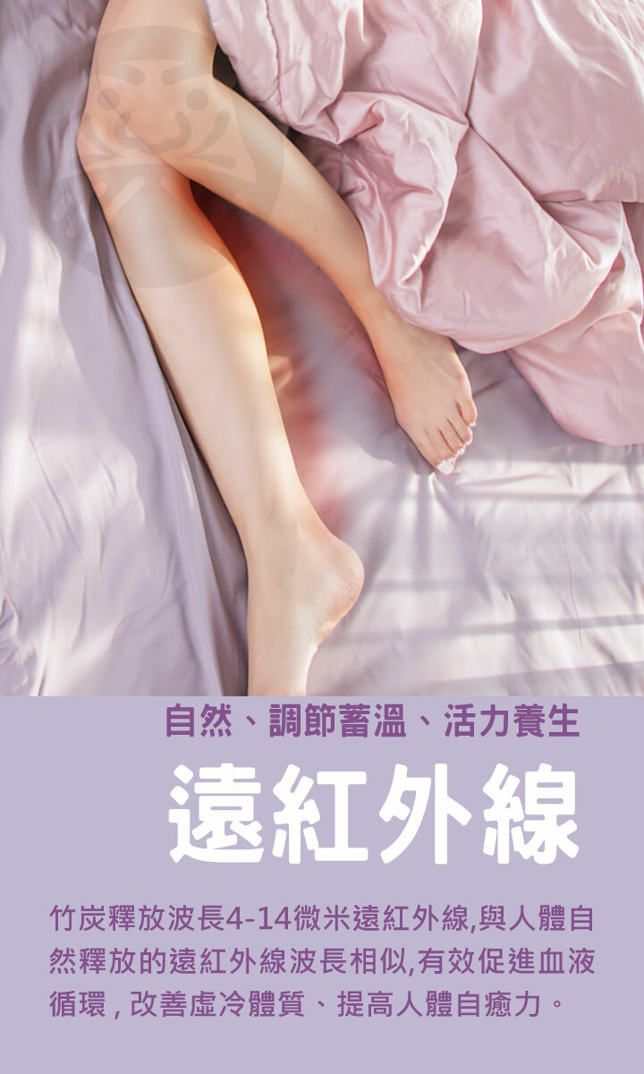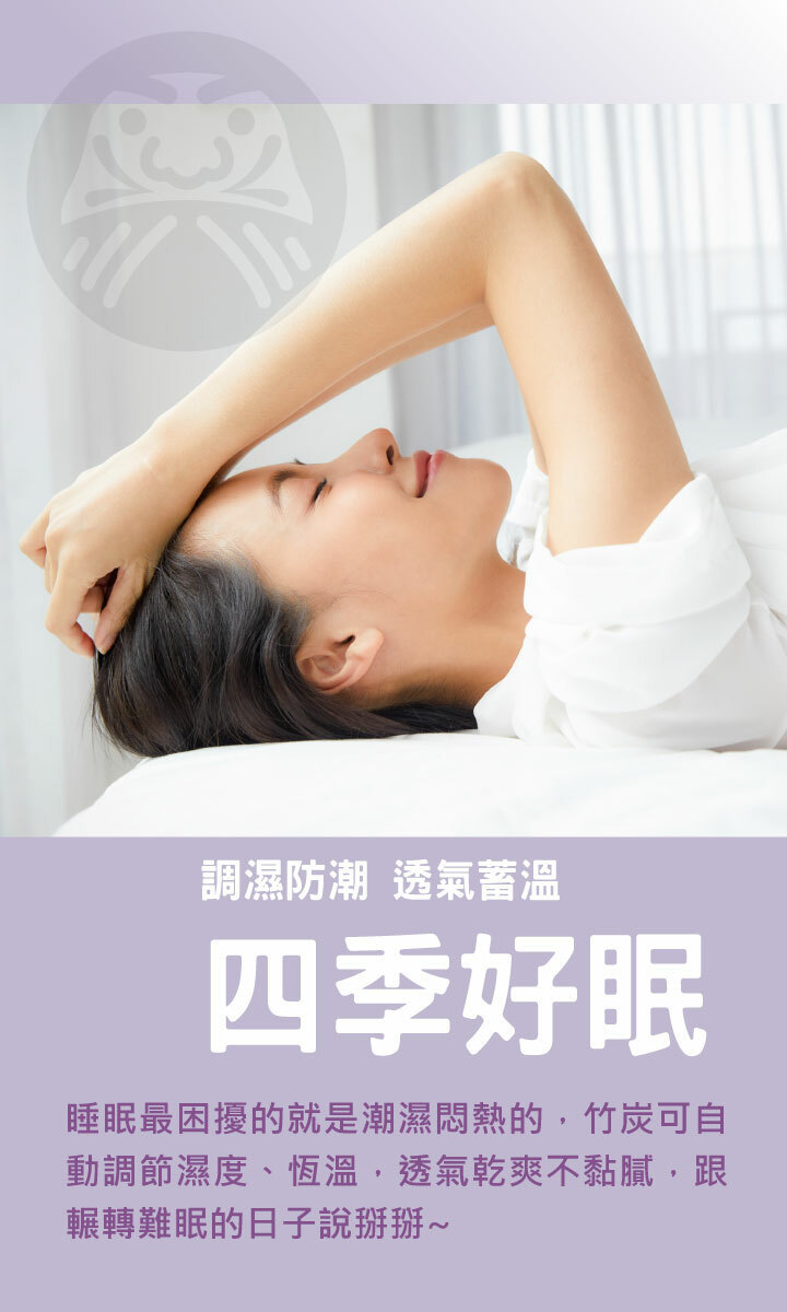●竹炭可吸汗、除臭、減少塵蟎的滋生,清淨室內空氣,讓氣喘或過敏者獲得更舒適的環境,提升睡眠品質。