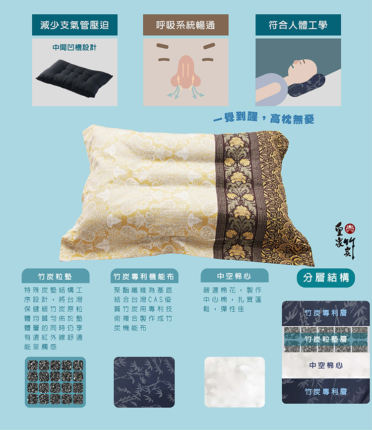 竹炭舒眠枕的竹炭粒墊層內含CAS國家驗證的優質竹炭,能釋放遠紅外線,促進血液循環。再加上竹炭多孔質特性,排除汗水濕氣、淨化空氣、隔離過敏源,幫助睡眠和提升休息品質
